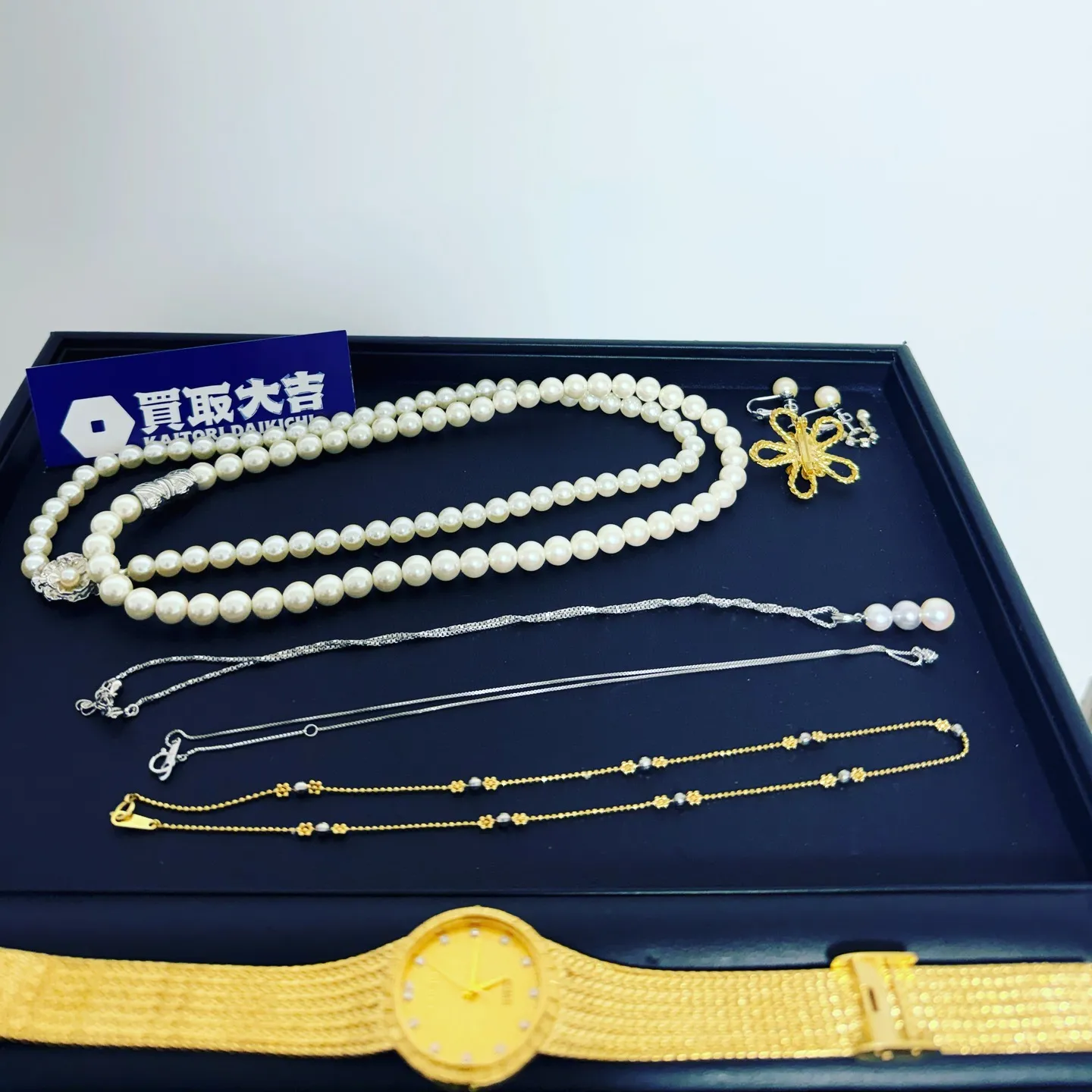 K18ネックレス、Pt850ネックレス、上品なパールネックレス、そして時を刻む時計。